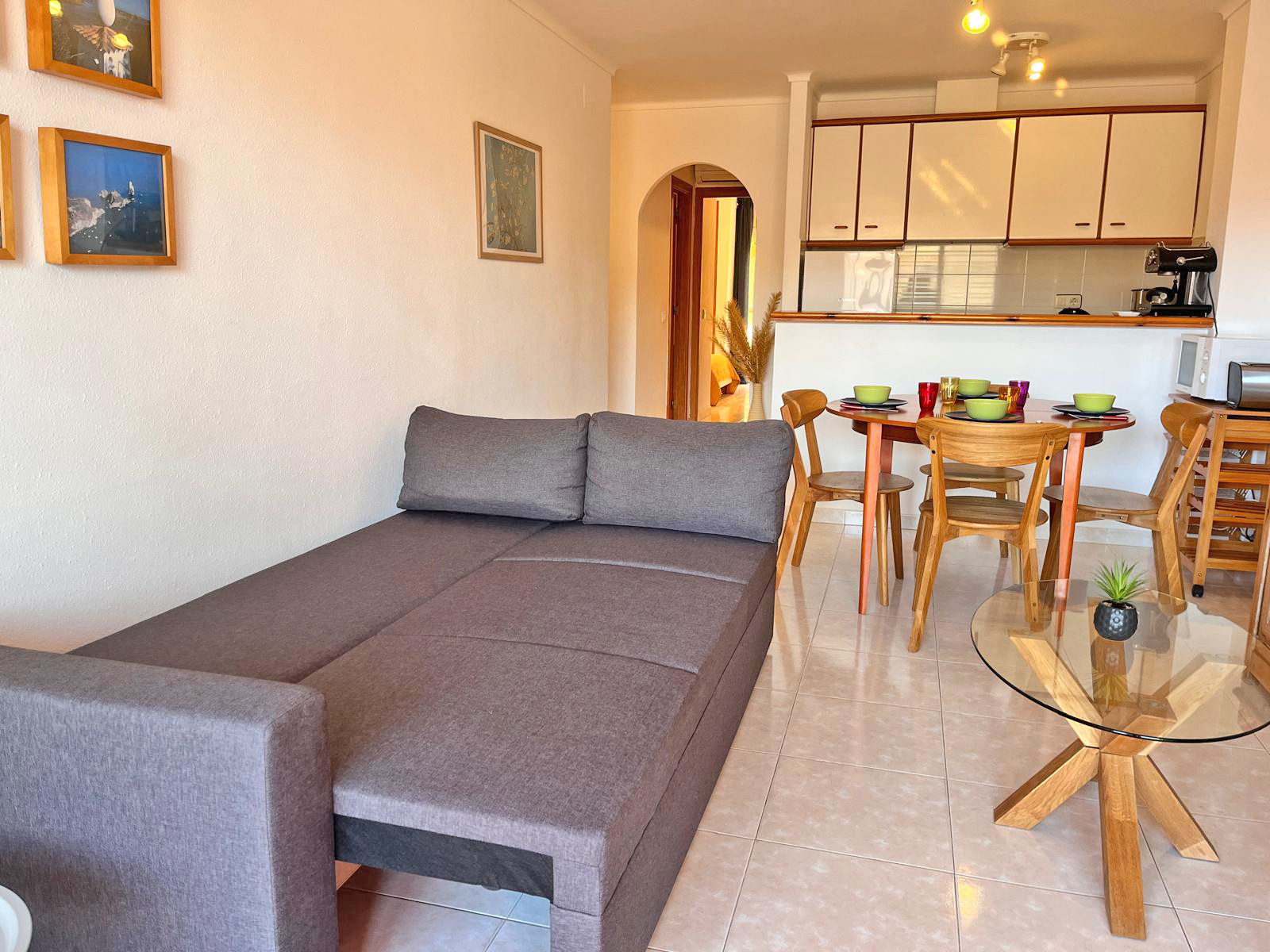 La cocina americana, de vitrocerámica, está equipada con nevera, microondas, vajilla/cubertería, utensilios de cocina, cafetera y tostadora.