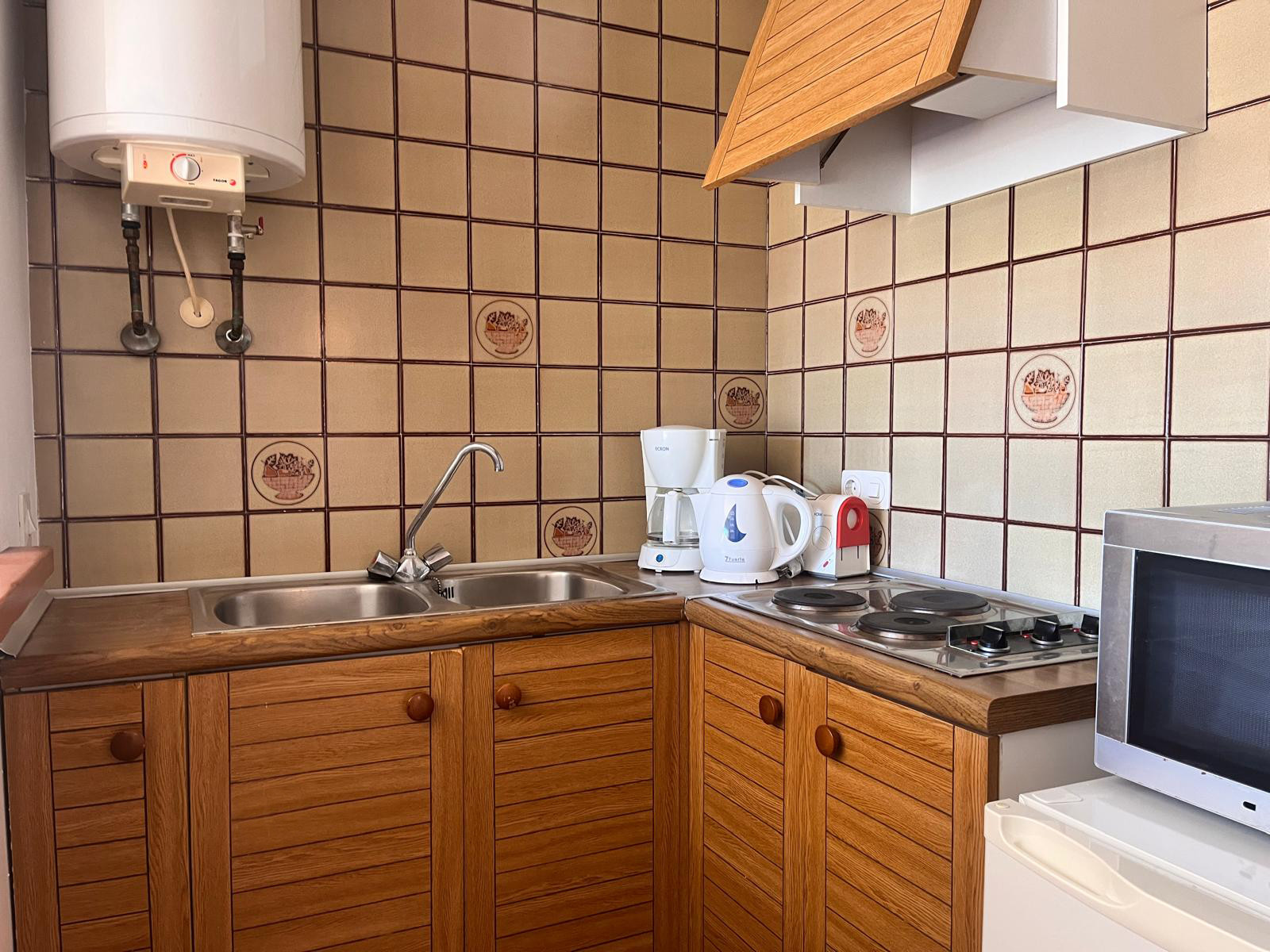 La cocina americana, eléctrica, está equipada con nevera, microondas, vajilla/cubertería, utensilios de cocina, cafetera y tostadora.
