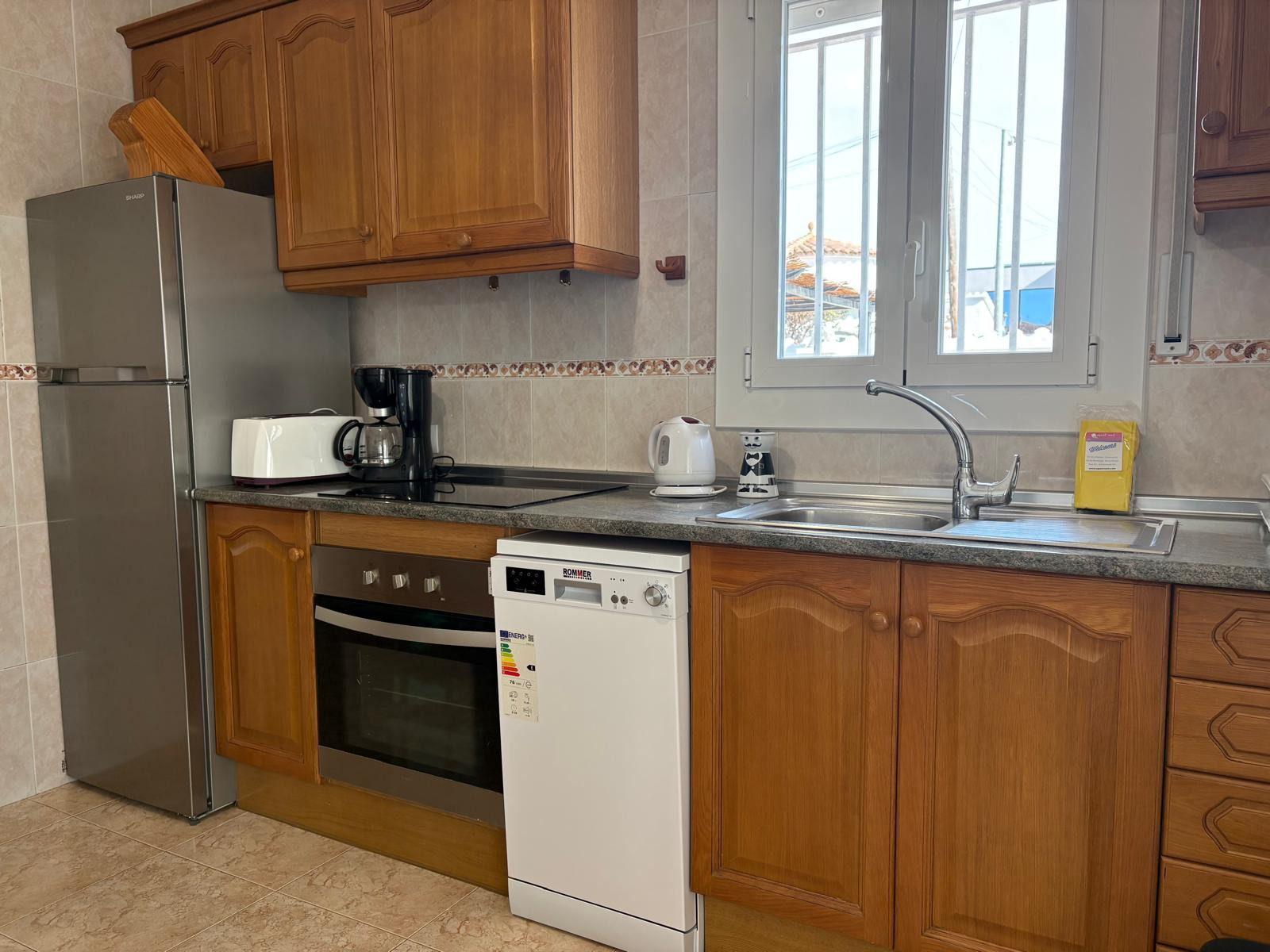 La cocina independiente, equipada con vitrocerámica, incluye nevera, horno, lavavajillas, vajilla, cubertería, utensilios de cocina y cafetera, ofreciendo todo lo necesario para disfrutar de una experiencia práctica y relajada.