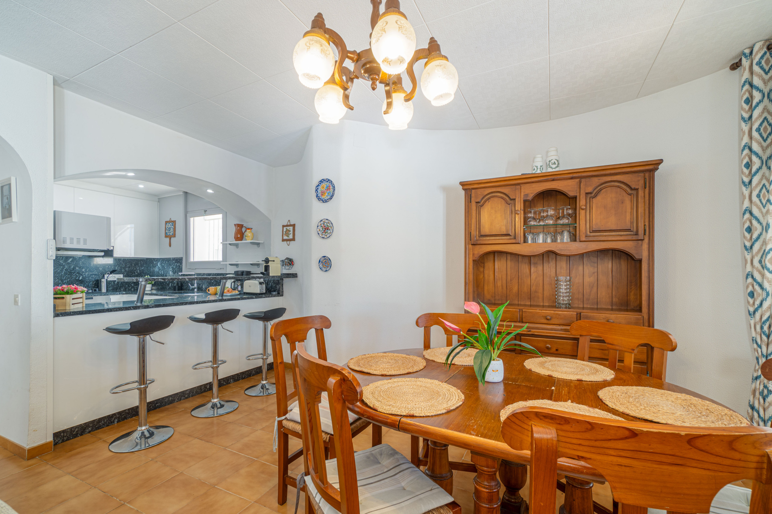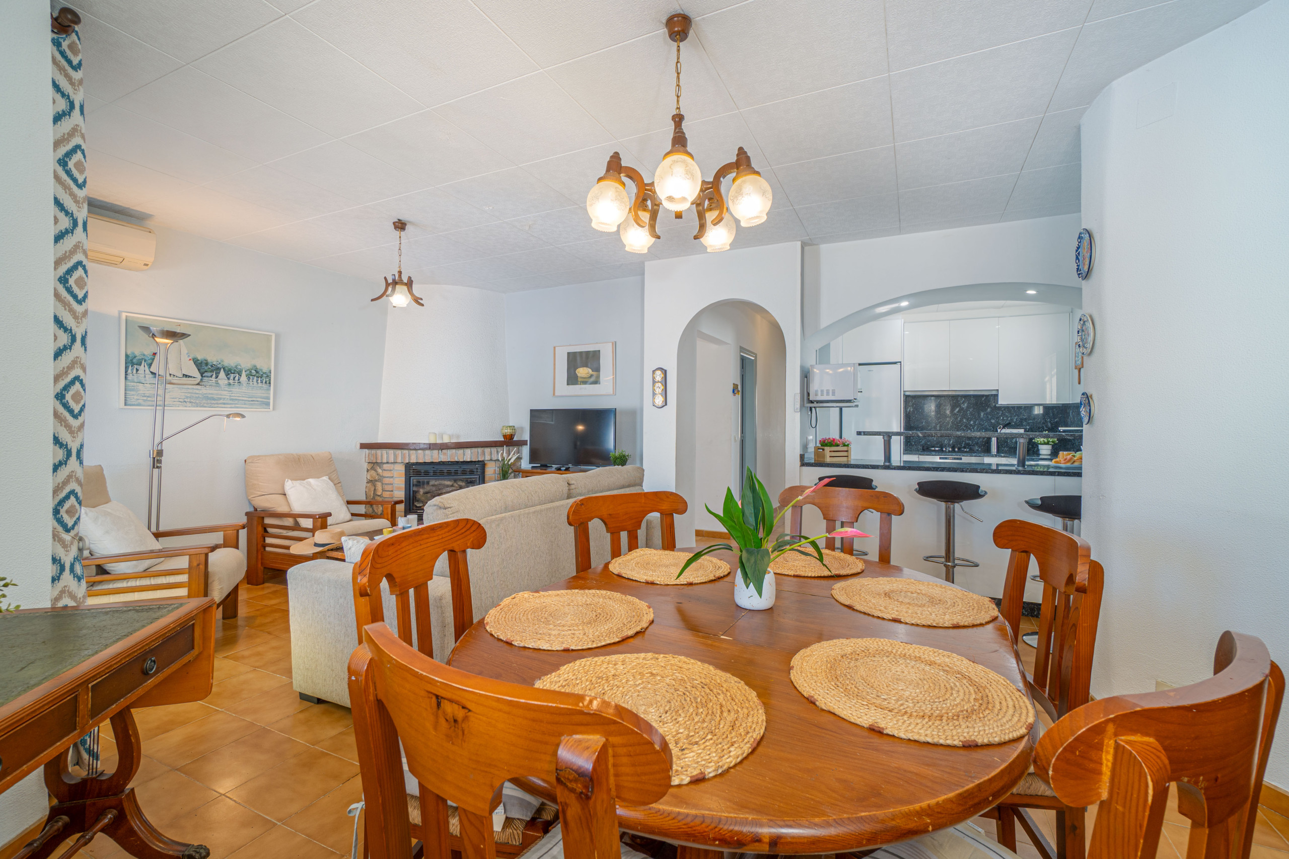 La cocina americana, equipada con vitrocerámica, incluye nevera, microondas, horno, lavavajillas, vajilla, cubertería, utensilios de cocina, cafetera, tostadora y hervidor de agua, ofreciendo todo lo necesario para disfrutar de una estancia práctica y relajada.
