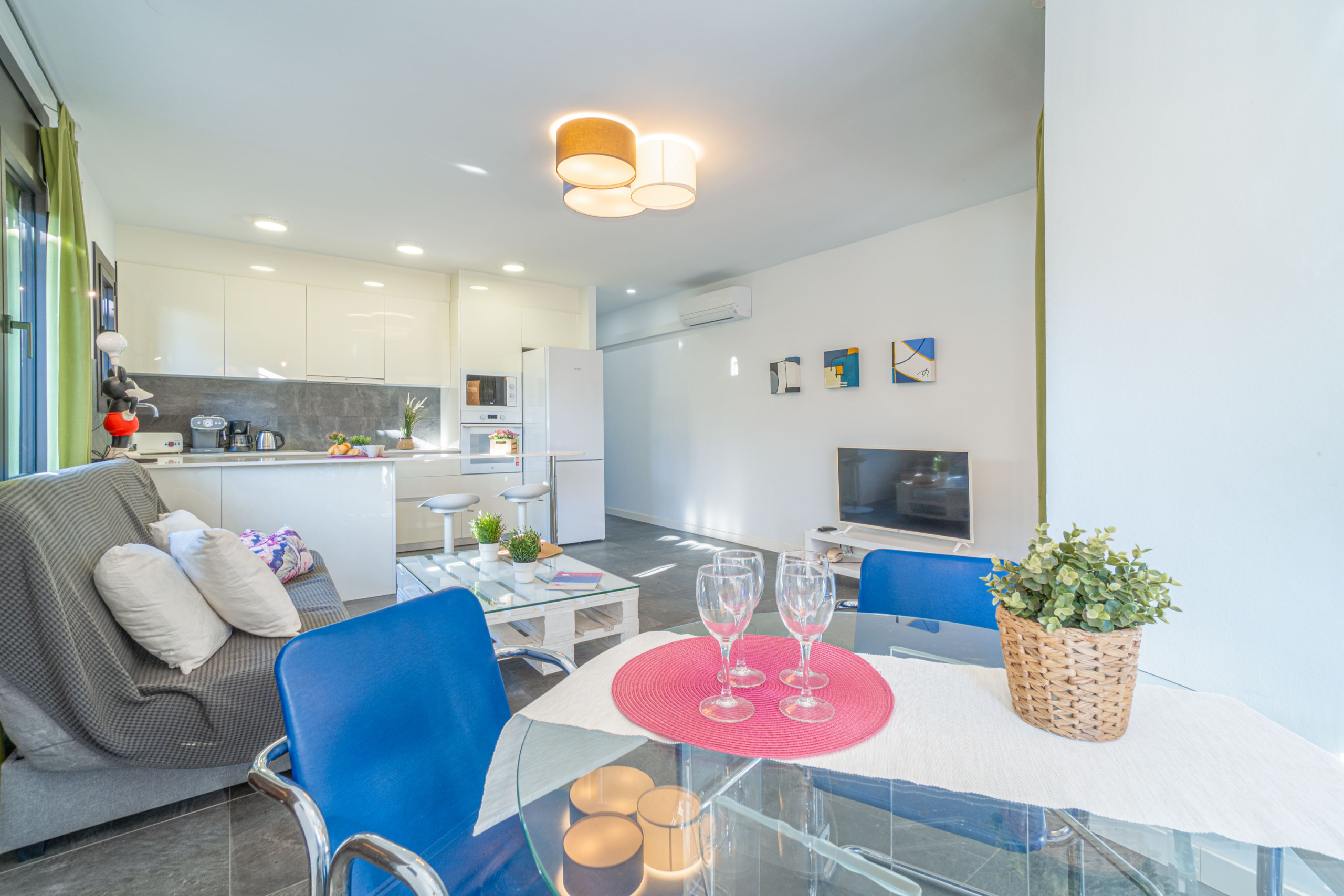 La cocina americana, equipada con vitrocerámica, incluye nevera, microondas, horno, vajilla, cubertería, utensilios de cocina y cafetera, ofreciendo todo lo necesario para una estancia cómoda y funcional.