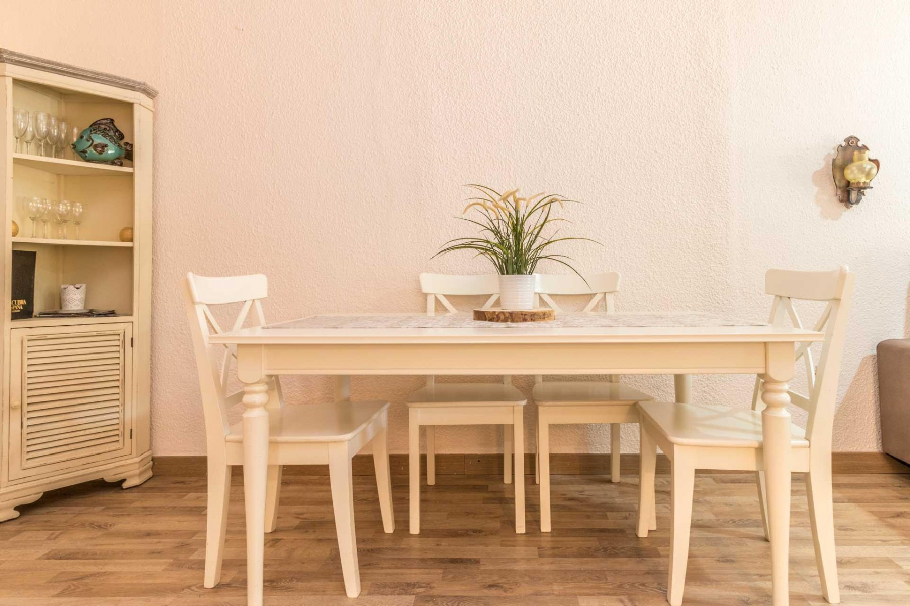 La cocina americana, equipada con vitrocerámica, incluye nevera, microondas, horno, lavavajillas, vajilla, cubertería, utensilios de cocina, cafetera, tostadora y hervidor de agua, ofreciendo todo lo necesario para disfrutar de una estancia práctica y relajada.