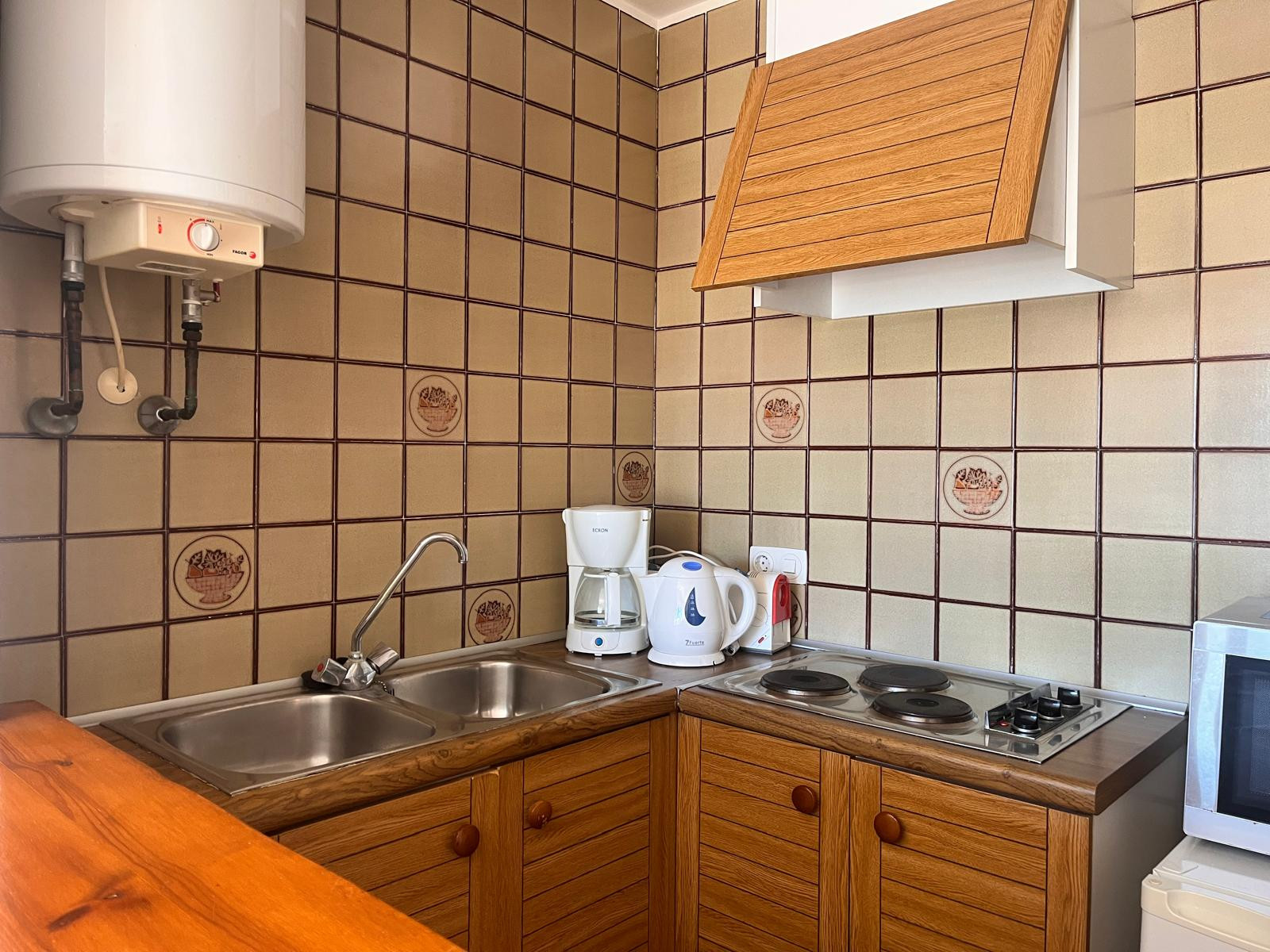Die offene elektrische Küche ist ausgestattet mit Kühlschrank, Mikrowelle, Geschirr/Besteck, Küchenutensilien und Kaffeemaschine.
