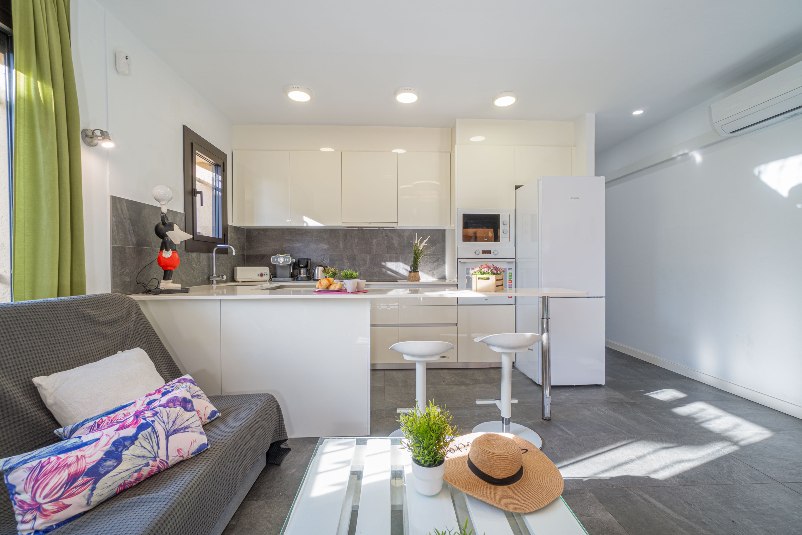The open-plan kitchen with ceramic hob is equipped with refrigerator, microwave, oven, freezer, washing machine, dishwasher, dishes/cutlery, kitchen utensils, coffee machine, toaster, kettle and juicer.