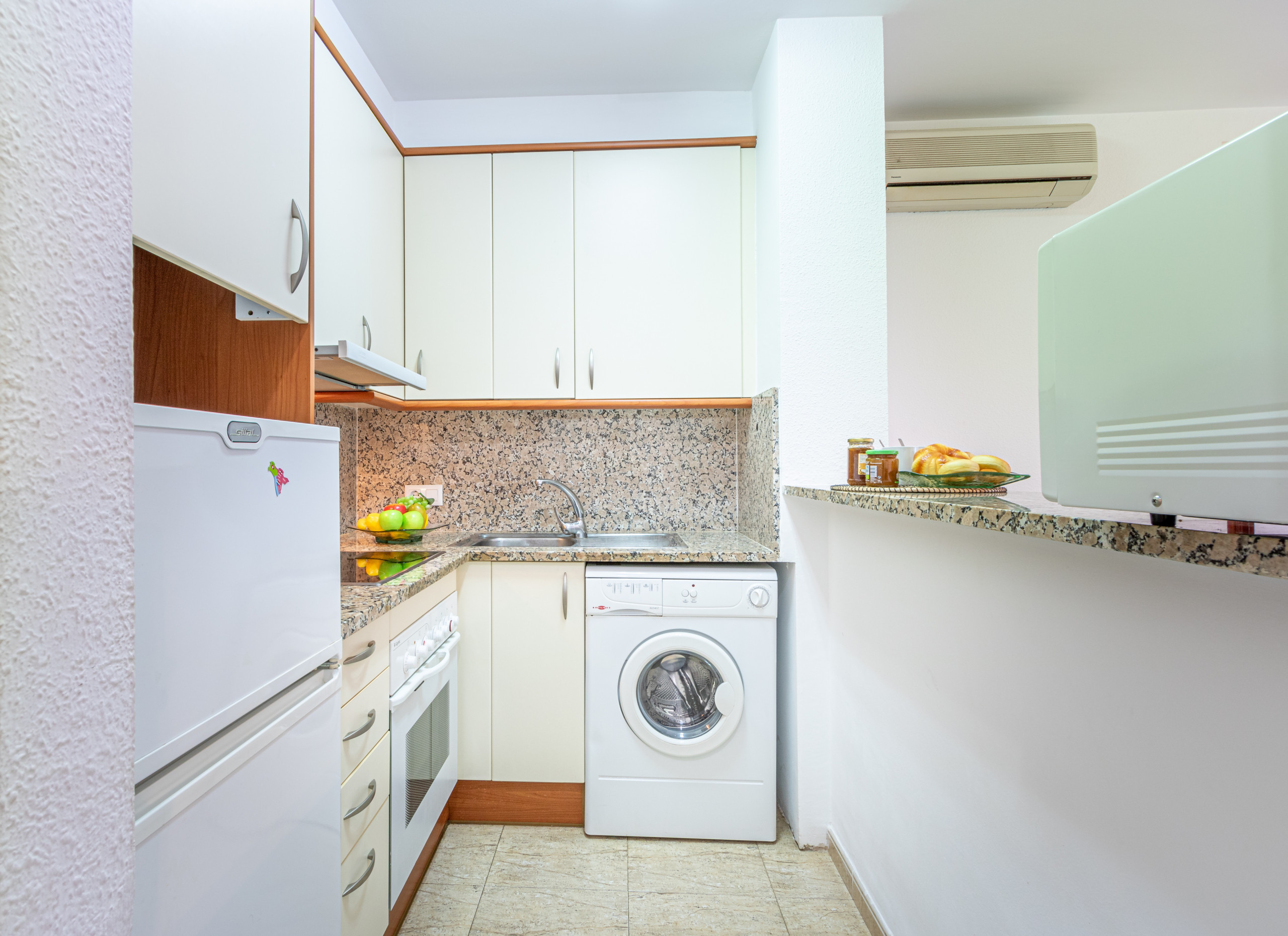 La cuisine américaine avec plaque vitrocéramique est équipée d’un réfrigérateur, micro-ondes, four, lave-linge, lave-vaisselle, vaisselle, couverts, ustensiles de cuisine, cafetière et grille-pain.