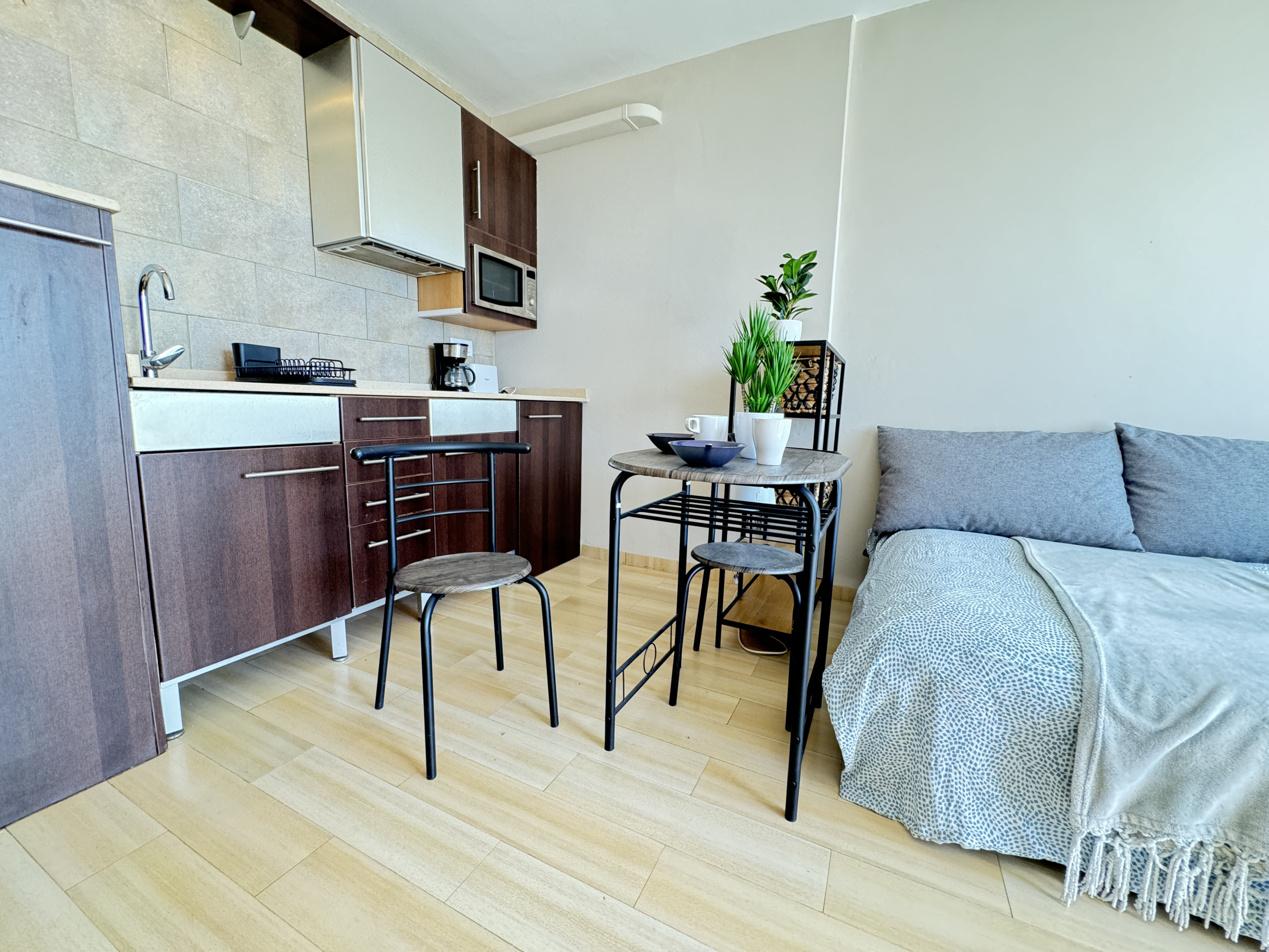 La cuisine américaine avec plaques vitrocéramiques est équipée d’un réfrigérateur, micro-ondes, vaisselle/couverts, ustensiles de cuisine, cafetière, grille-pain et bouilloire.