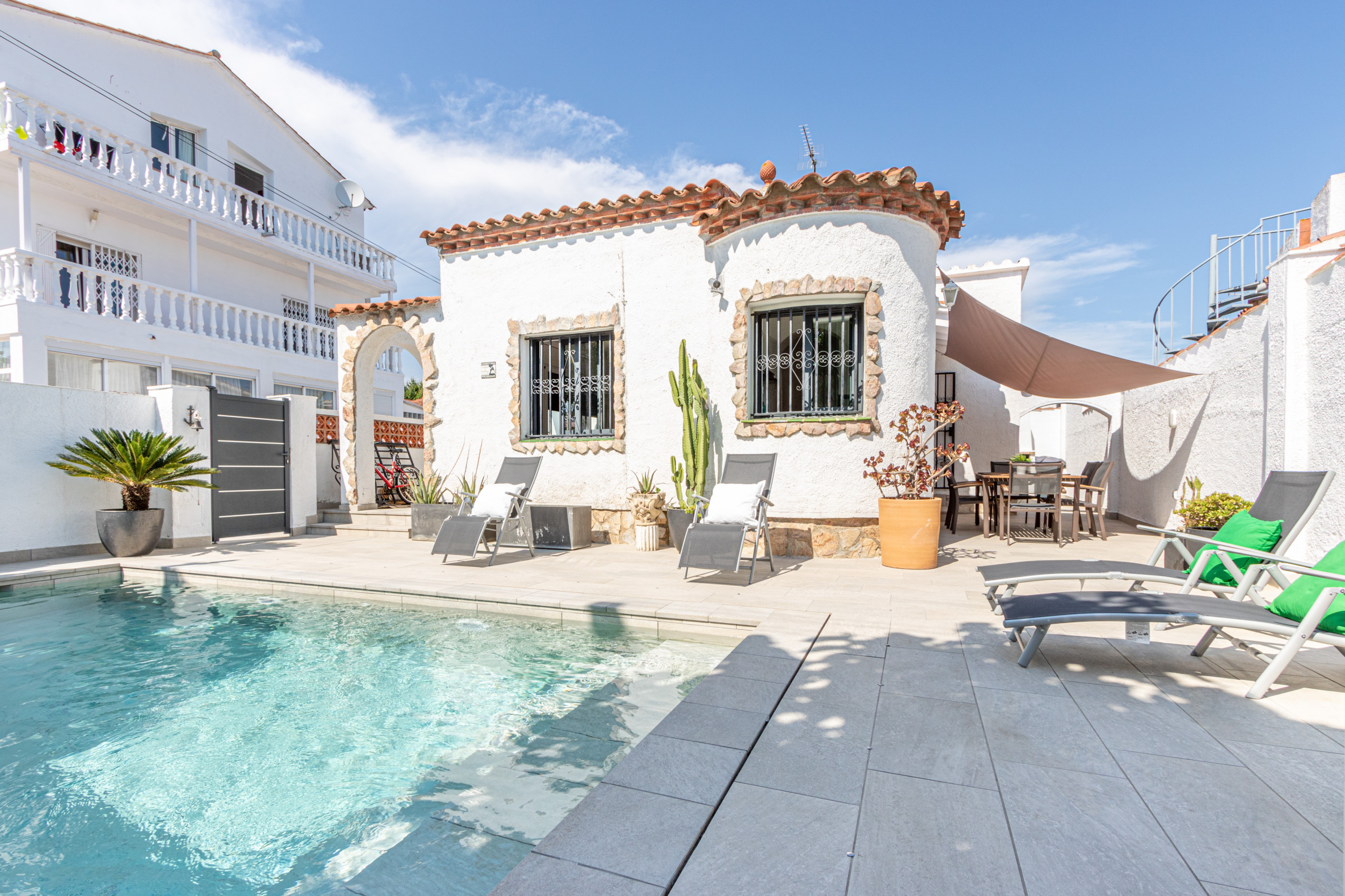 Вилла в Эмпуриабраве располагает 3 спальнями и рассчитана на размещение до 7 человек. Просторное и комфортное жильё площадью 100 м² с видом на бассейн, идеально подходящее для семейного отдыха на Коста-Брава.