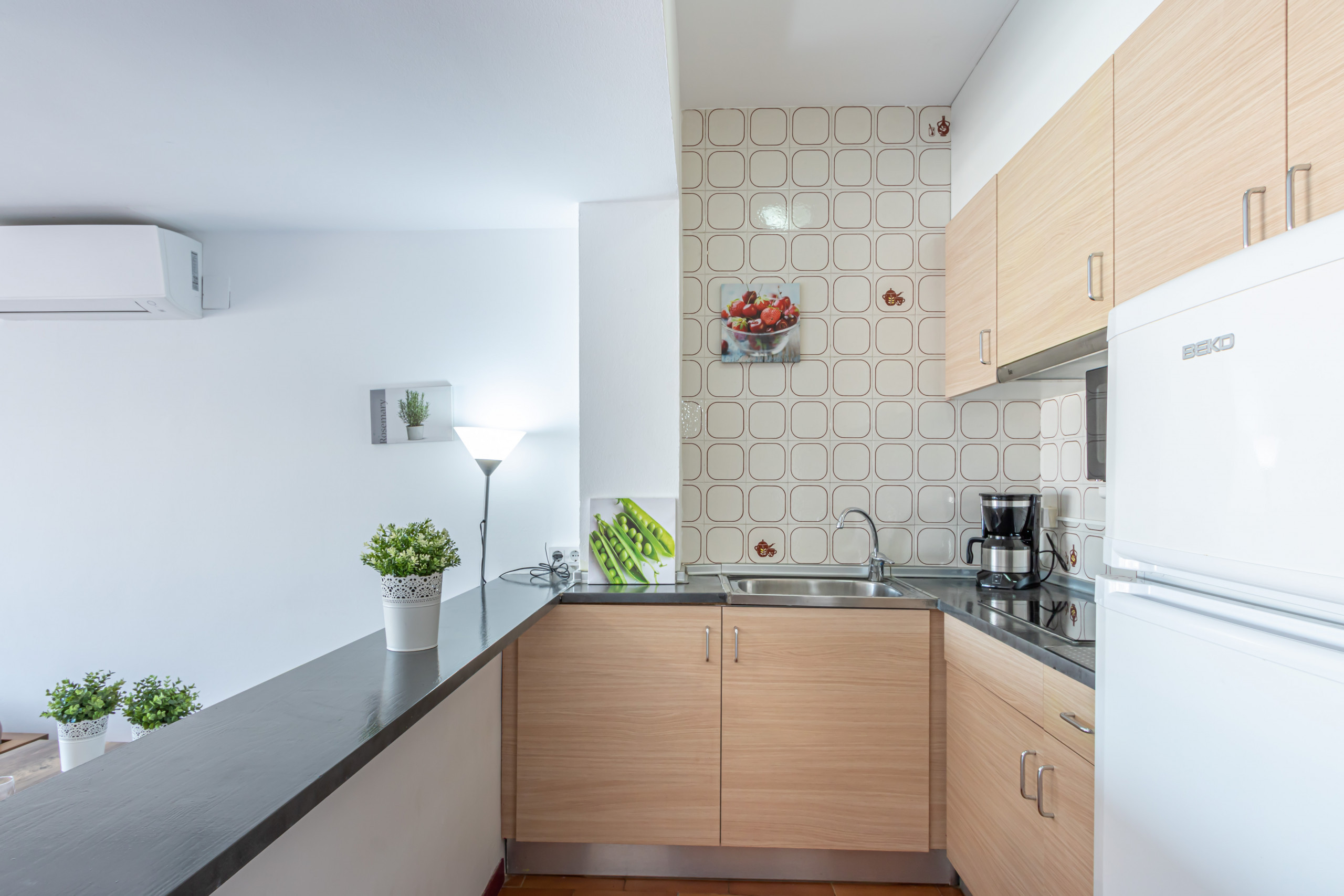Кухня открытого типа с варочной панелью оснащена холодильником, микроволновой печью, посудой, кухонными принадлежностями, кофеваркой и тостером.